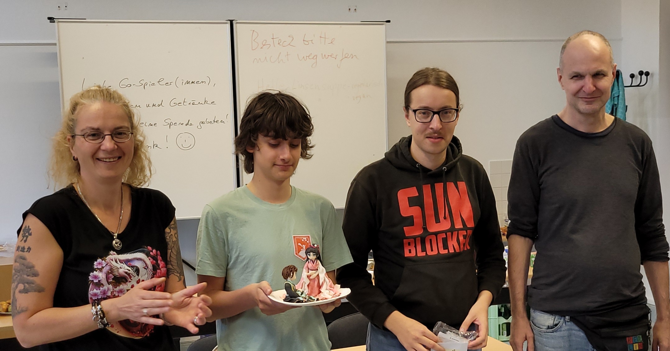 Beim 19. Go-Turnier in Schwerin am 21. und 22.09.2024 mit 51 Teilnehmern siegte Lukas Wandelt 4d aus Oldenburg mit 5 Siegen, vor Adam Dottan 3d aus Berlin und Alexander Kurz 2d aus Berlin (Foto). Turnierleiterin Janet Bommert kündigte die 20. Drachenschlacht für den 20.09.2025 an, wieder mit Themenkuchen (Foto) von Anja Klebow.